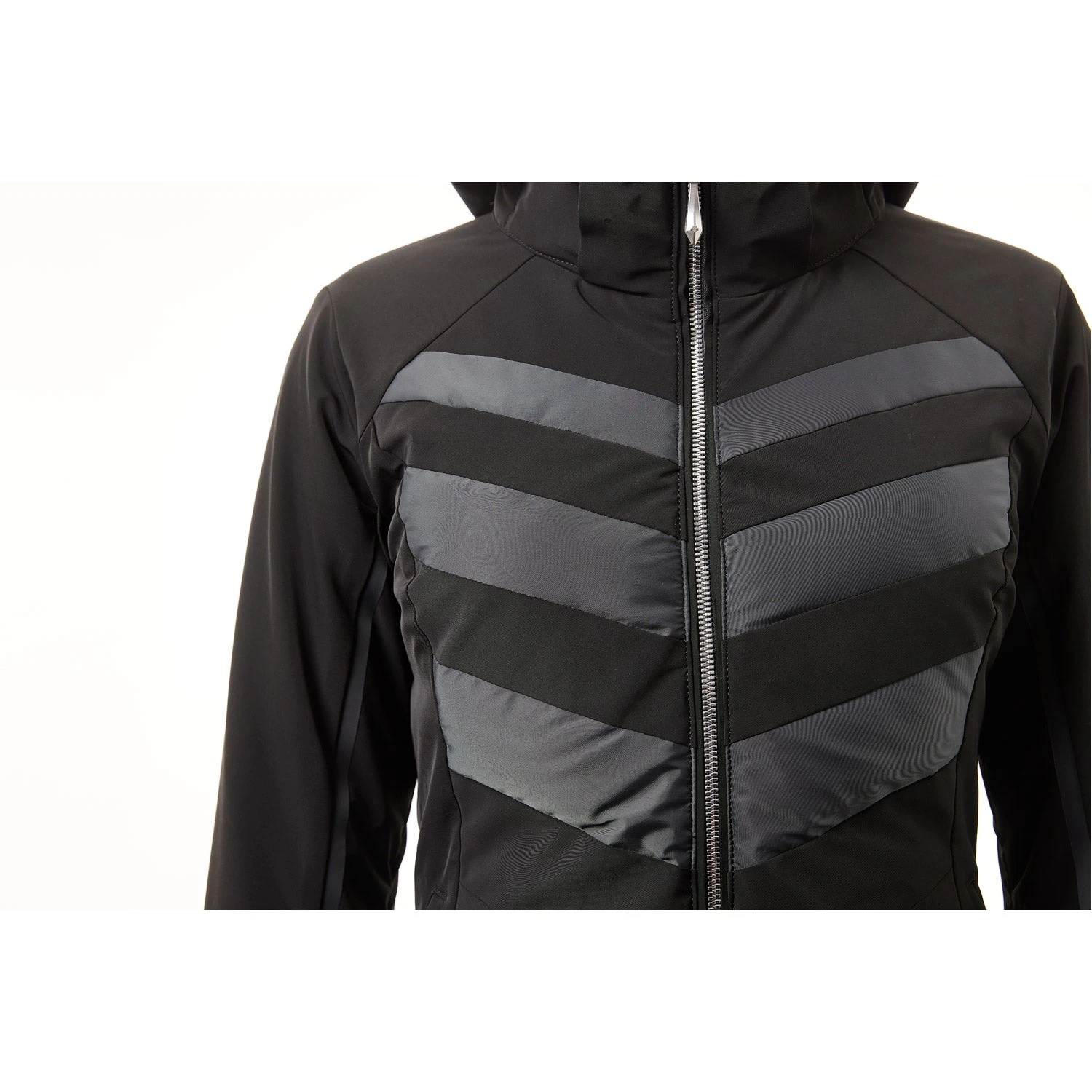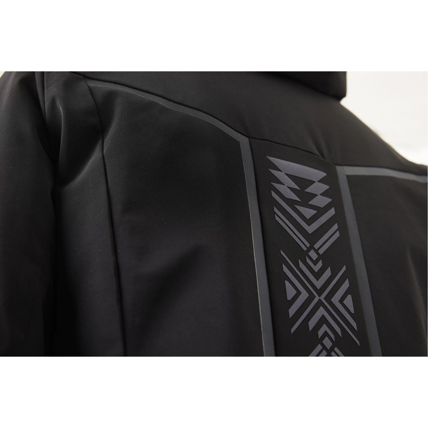 An elegant, sporty jacket featuring a powerful primitive motif on sleeves and center back. Satin fabric inset stripes are laser cut and attached using a new adhesive process. The elegance is reinforced by the alternating gloss and matte effect, with hybrid down insulation giving it a three-dimensional feel. The dual direction silver foil fastener also adds a feeling of strength, but is actually light and easy to use. The removable fur boas for the hood continue for this season and are sold separately.